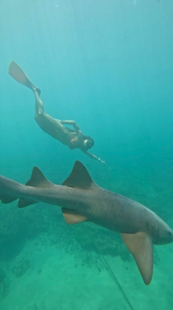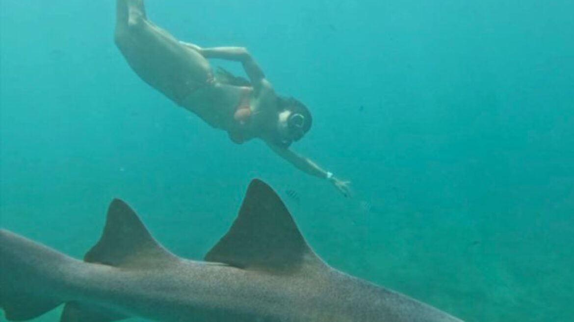 Três meses após o incidente, Tayane Dalazen mergulha novamente com tubarões-lixa e destaca conexão com a natureza e respeito à vida marinha